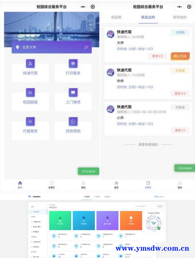 开源校园综合服务微信小程序源码 包括快递代取、打印服务、校园跑腿、代替服务、上门维修和其他帮助。可用于搭建校园综合服务平台。共有6个选项可供选择,包括快递代取、打印服务、校园跑腿、代替服务、上门维修和其他帮助。 使用该源码需要自备服务器和备案过的域名,推荐使用2核4G服务器。最低配置要求为1核2G。附件文件包含详细部署教程。