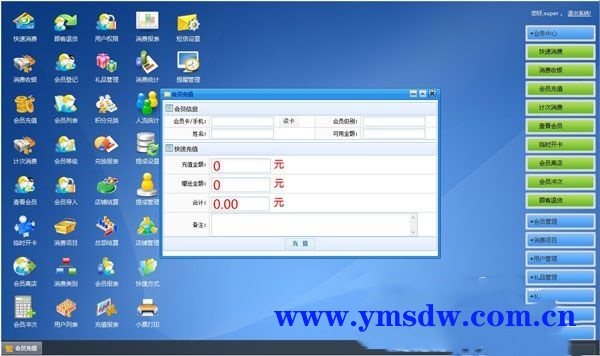 ◆业务中心(快速消费 消费收银 会员充值 计次消费 查看会员 临时开卡 会员离店 会员冲次 顾客退货)