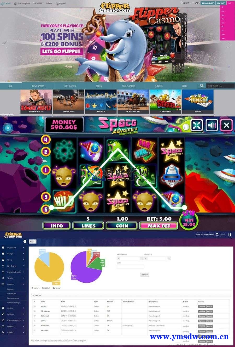 系统支持8种语言、50种游戏,支持Paypal、手动充值、BTC支付。