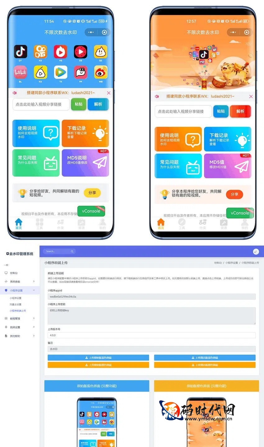 2.多套商业级模板•蓝色版:清爽界面设计,集成流量主广告位(原生广告、插屏广告、激励视频广告),支持高清视频解析与一键保存